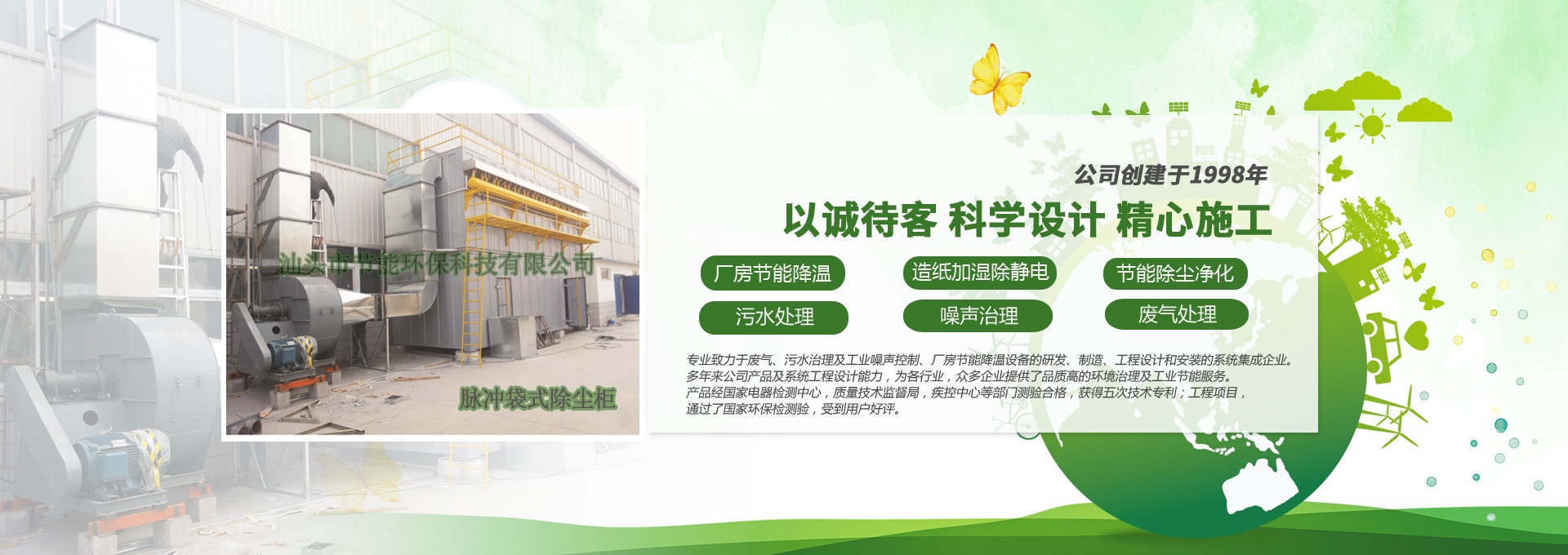 汕頭市節(jié)能環(huán)??萍加邢薰緞?chuàng)建于1998年,是一家專業(yè)致力于廢氣、污水、粉塵、噪聲治理,廠房節(jié)能降溫設(shè)備的研發(fā)、制造、工程設(shè)計(jì)和安裝的系統(tǒng)集成企業(yè)。多年來(lái)公司產(chǎn)品及系統(tǒng)工程設(shè)計(jì)能力,為各行業(yè),眾多企業(yè)提供了品質(zhì)高的環(huán)境治理及工業(yè)節(jié)能服務(wù)。產(chǎn)品經(jīng)國(guó)家電器檢測(cè)中心,質(zhì)量技術(shù)監(jiān)督局,疾控中心等部門測(cè)驗(yàn)合格,獲得五次技術(shù)專利;工程項(xiàng)目通過(guò)了國(guó)家環(huán)保檢驗(yàn)檢測(cè),受到用戶好評(píng)。